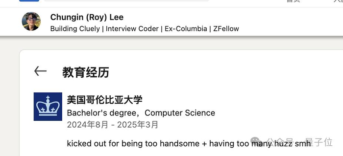 好笑的是,小李LinkedIn上写的是「因为太帅+太受欢迎」,所以被哥大退学。
