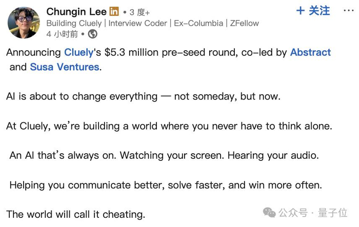 21岁小哥(称他为小李)这几天公布了一则喜讯,他们初创公司Cluely获得来自两家机构Abstract Ventures和Susa Ventures提供的种子资金。
