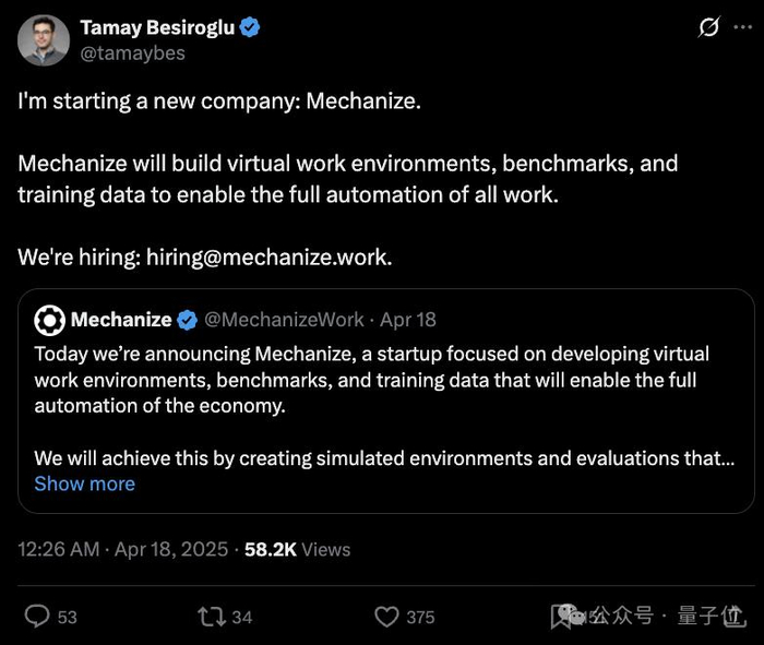Mechanize,其创始人Tamay Besiroglu曾参与创办Epoch AI,曾在MIT全职当研究科学家, 他表示这家初创公司的目标是“实现所有工作的完全自动化”和“经济的完全自动化”。