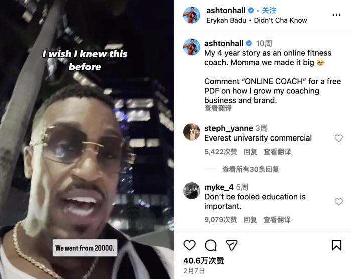 现在,Ashton的视频里经常出现的内容,就是展现曾经失败的自己,炫耀如今的成功。2018年的他开着二手破车,交不上房租;2025年的他开着宾利,住在豪宅里给粉丝上成功学网课。