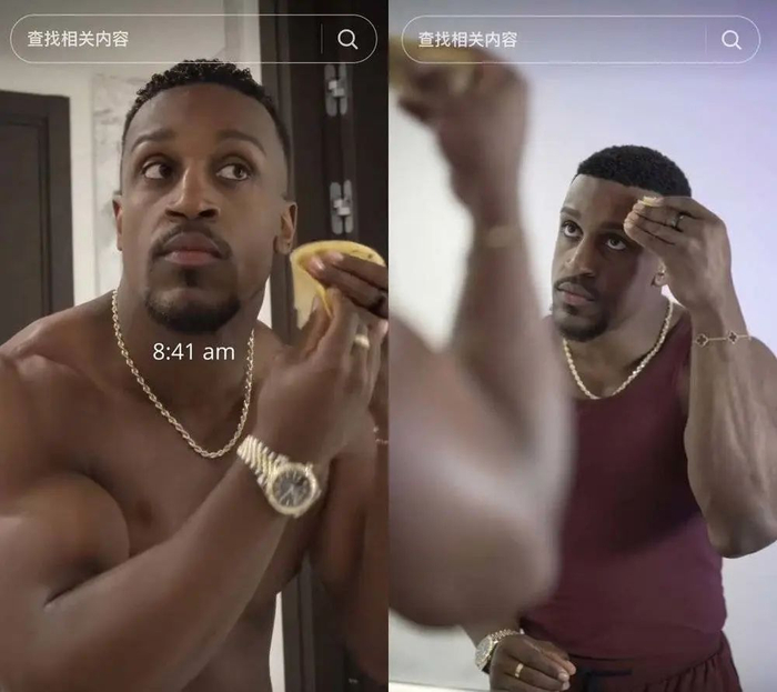 当他拿出一根香蕉的时候,大多数观众还以为是健身后的快碳补充,我们恰恰错了——他用香蕉皮细细擦拭皮肤,为了达到美容的效果。