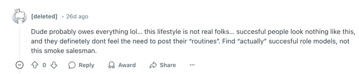 无非就是在布置好的豪宅摄影棚里,打开摄像头,拍摄妆容精致的自己假装在凌晨3点醒来,用两个小时的时间表演一套“Morning Routine”组合拳,然后下班收工回家睡觉。