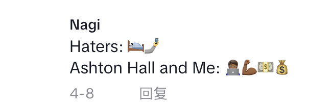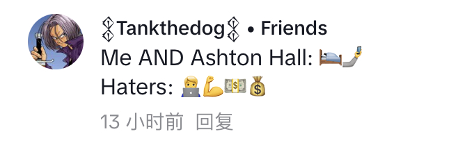一开始,Ashton的粉丝会用一系列emoji反击黑子,大意是:“黑子躺在床上睡大觉,而我和Ashton一起挣圆子”。