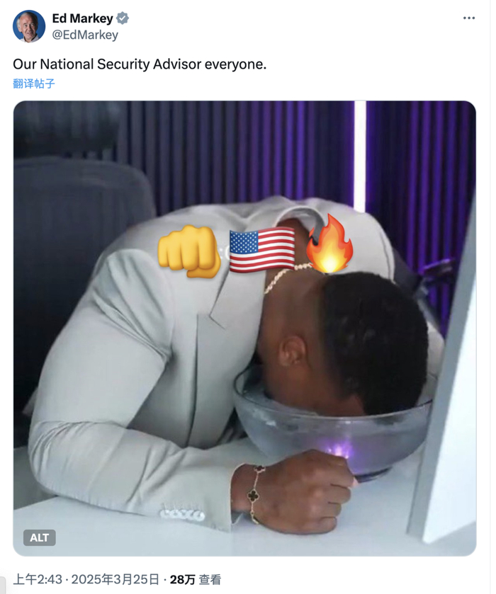几乎全体美国网友都看过他的装X视频,甚至连民主党参议员都拿他当梗图,嘲笑国防部长群聊泄密的“美爷冲击”事件。