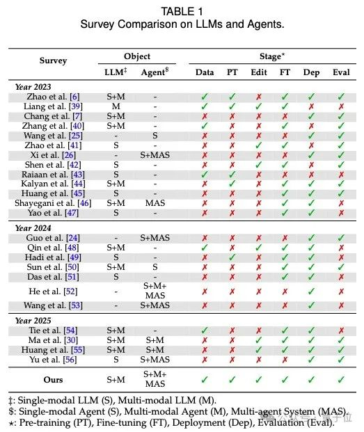 1. 对象覆盖全面:本篇survey涵盖了单模态和多模态的大型语言模型(LLM)以及代理(Agent),包括单代理和多代理系统。这种全面的覆盖使本篇研究更具广泛性和适用性。2. 阶段完整性:本篇survey在数据、预训练(PT)、编辑、微调(FT)、部署(Dep)和评估(Eval)等所有阶段都进行了详细的分析和比较。这种全面的阶段覆盖确保了对LLMs和Agents的全方位理解。3. 最新研究:相比于2023年、2024年和2025年的其他研究,本篇survey在所有关键阶段都提供了深入的见解和分析,确保读者获得最新和最全面的信息。4. 多模态支持:本篇survey不仅支持单模态,还支持多模态的LLM和Agent,反映了当前技术发展的趋势和需求。通过这些优势,本篇survey为研究人员和从业者提供了一个全面、深入且最新的参考工具,帮助他们更好地理解和应用LLMs和Agents。