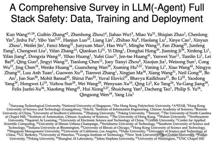南洋理工大学、新加坡国立大学等全球40余所顶尖机构的67位学者联袂打造大模型全链路安全综述,综合梳理了843篇文章,系统的从全栈视角分析了大模型从出生到应用的全栈安全,涵盖数据准备→预训练→后训练→部署→商业化应用以及安全性评估等全部阶段。
