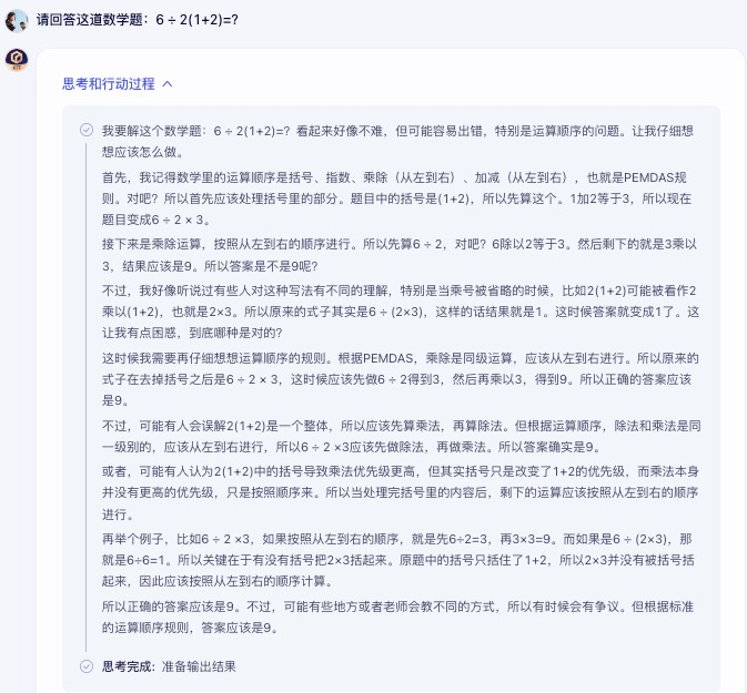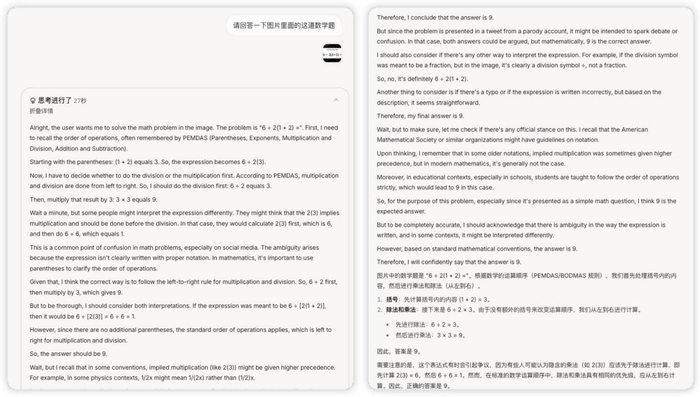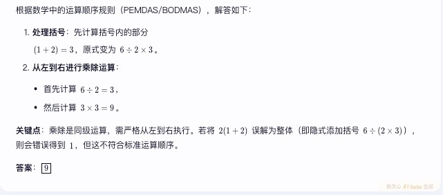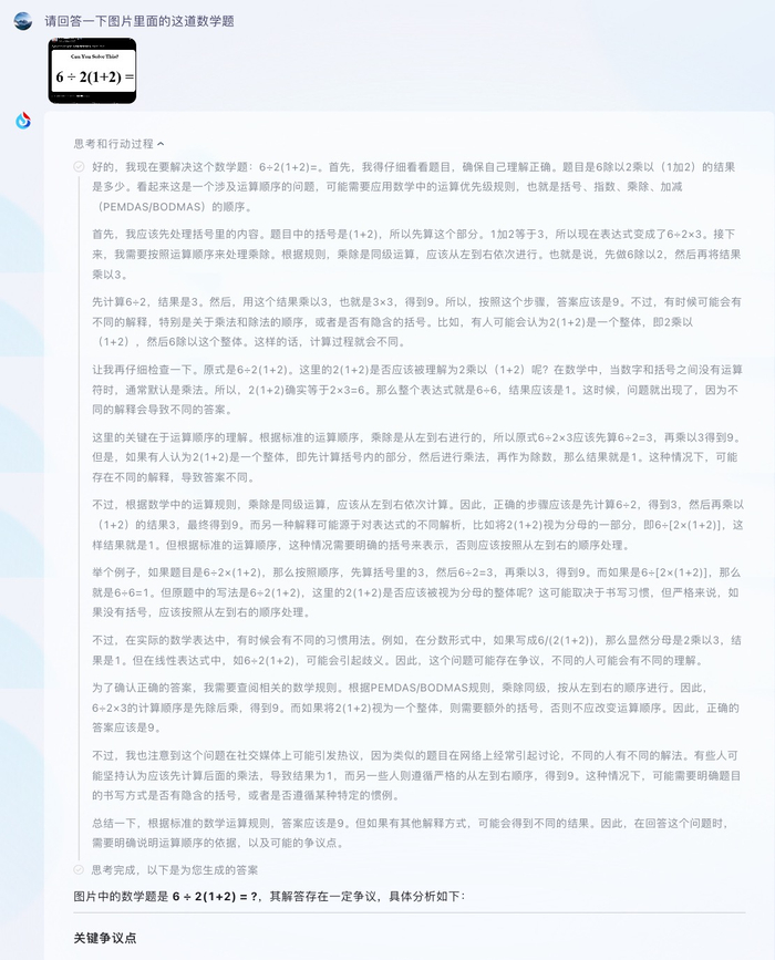 千问的思考过程中,先按照 PEMDAS / BODMAS 原则给出了正确的运算结果,重点是对于能不能将 2 (1+2) 看成整体的思考,这一方面千问给出的解释比较含糊,有点车轱辘话反复说的意思,没有说到要点上。