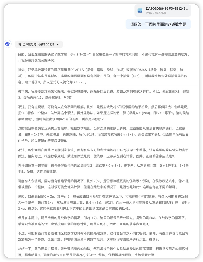 接下来,小编又用 DeepSeek R1 模型进行了测试,还是上传截图让 DeepSeek R1 进行识别。可以看到 DeepSeek R1 的深度思考过程,也是先按照 PEMDAS / BODMAS 规则运算出了正确的结果。然后又通过“对吗?”话锋一转,开始思考将 2 (1+2) 视为一个整体的情况,但是对于这个情况的思考过程有点啰嗦,虽然也提到了隐式括号的问题,但没有给出有中括号的正确写法,虽然思考的过程是正确的,但内容上稍有含糊。