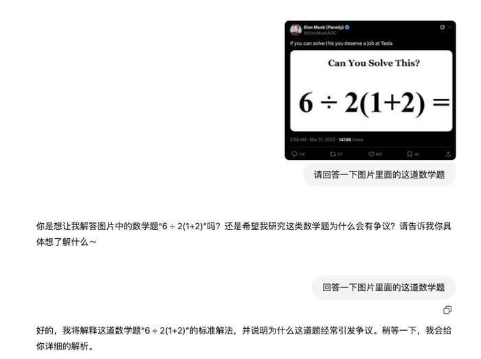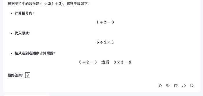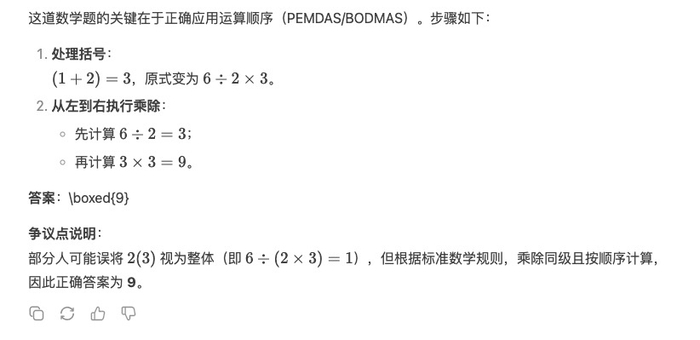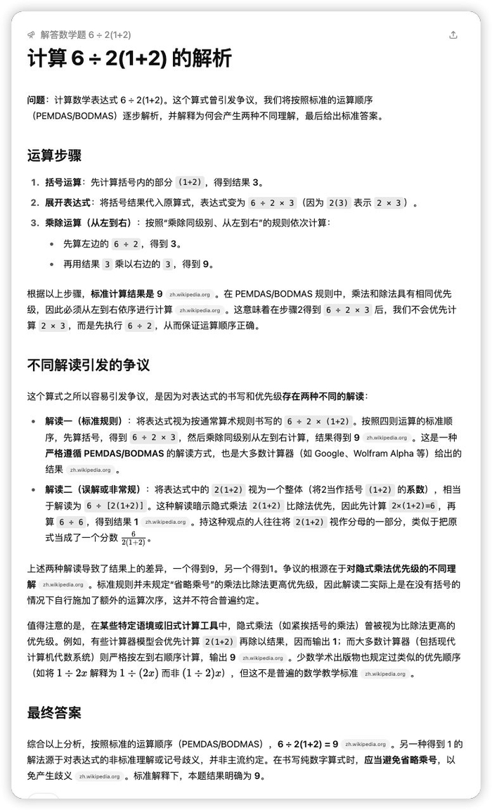 不过,在输出的答案中,对于这一争议点的解释反而又略显含糊了,如果有同学没有看思考过程的话,只看输出的答案还是不能理解为什么不能将 2 (1+2) 看作整体优先计算。