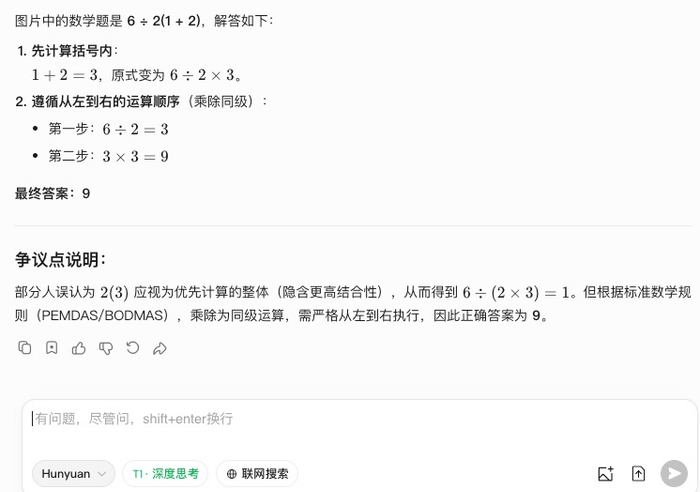 腾讯混元 T1 的思考过程整体看下来是没什么问题的,对于能不能将 2 (1+2) 看成整体的解释也比较明确,还给出了可以看成整体时的正确写法:6 ÷ [2×(1+2)]。