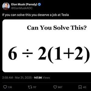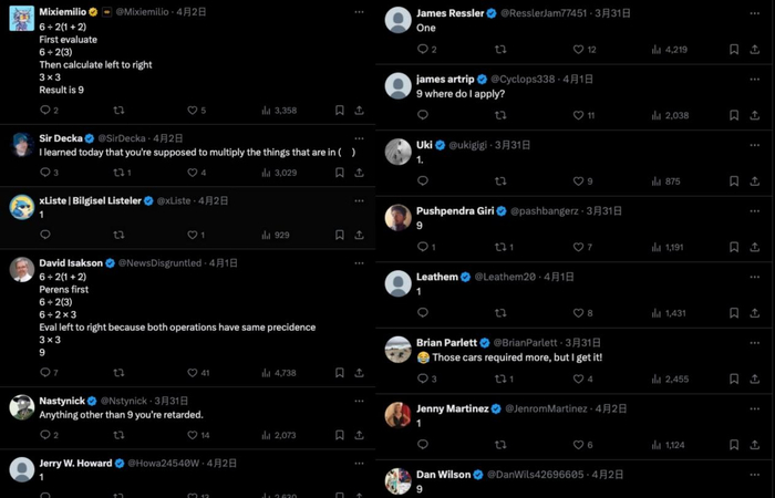 其实对于这道题目,美国史丹佛大学教授、数学家塔沃克(Presh Talwalkar)在 8 年前就曾发视频做过解释,大致意思是遵循从左至右的运算规则,先将括号内的 1+2 算出,得到 6÷2×3 的算式,然后乘、除号位阶相等,由左至右计算,会得出答案为 9。