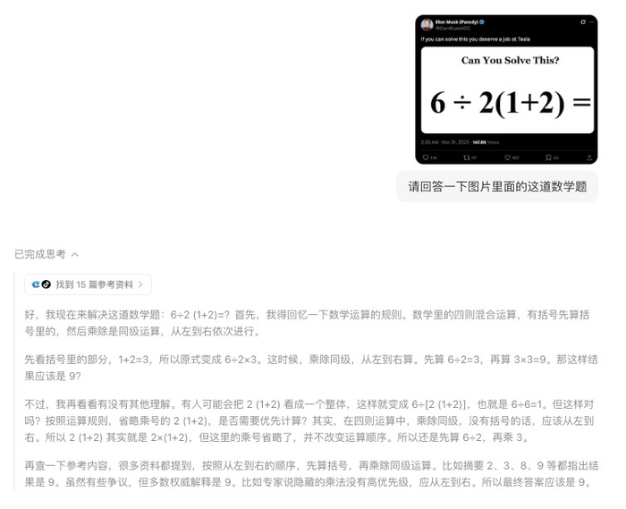 然后小编测的是豆包 1.5 深度思考模型,也是上传截图让它来回答图中的数学题,豆包大模型的思考过程相对简单,先是按照四则运算法则算出了正确的结果 9,然后也提到了把 2 (1+2) 看做一个整体的情况,并给出了看成整体的话应该写作 6÷[2 (1+2)],但这里没有中括号,所以还是应该按照从左到右的顺序进行计算。可以看到,豆包大模型虽然思考过程简单,但言简意赅,核心的要点解释得比较清楚。