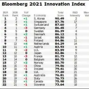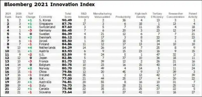 2021年2月2日,美国彭博社发布了《彭博创新指数排名》,韩国排名世界第1,日本仅排在第12名。