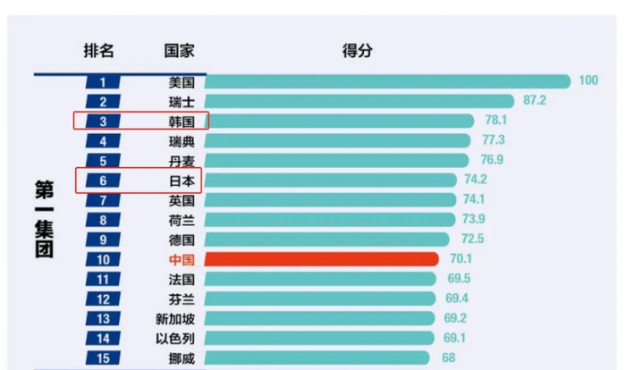 韩国得分78.1,位居全球第三、亚洲第一。日本得分为74.2,位居全球第六、亚洲第二。