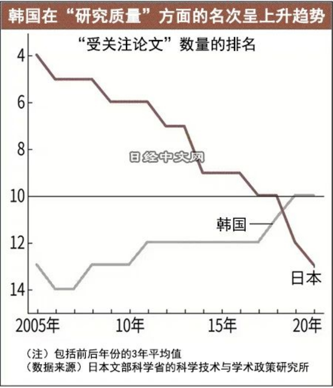 日本文部科学省统计发现,韩国的“受关注论文”数量(即被其他论文引用的次数排在前10%的论文)排名不断上升,于2019年超越日本。