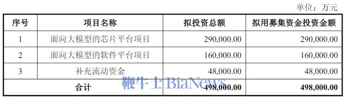 寒武纪此次49.8亿元的融资中,29亿元用于面向大模型的芯片平台项目,16亿元用于面向大模型的软件平台项目,4.8亿元用于补充流动资金。