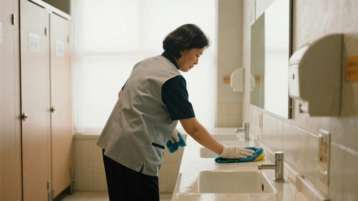 记得,刚来那会儿,她还有点不适应——男厕所气味呛人,地上的烟头、喷溅出来的尿迹,有时候一拖就带着一身烟味。但她觉得工作还轮不到她挑挑拣拣,不适应也得干活。