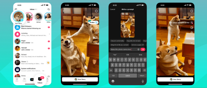 用户通过AI Alive创建并发布的Stories内容,将有机会在“为你推荐”和“关注”信息流以及个人资料页面中展示。