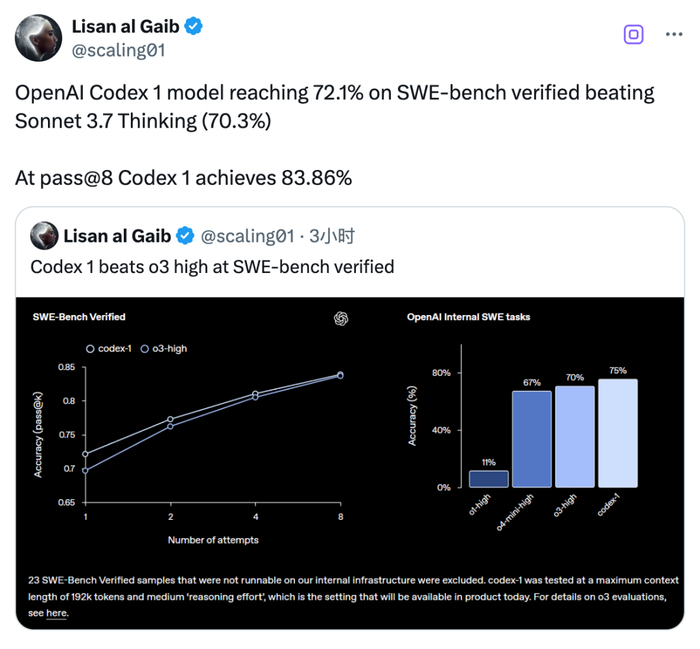 基准测试结果显示,codex-1 在 SWE-Bench 的得分为 72.1%,纸面参数优于 Claude 3.7 以及 o3-high。