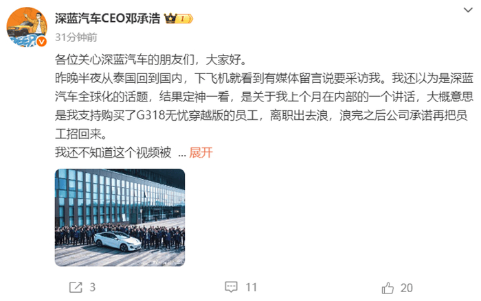 视频中,他提出一项“特殊福利”:购买深蓝G318无忧穿越版车型的员工可申请离职两个月,期间外出旅行或陪伴家人,结束后公司承诺召回返岗。网友将其总结为“买车送离职假期”。
