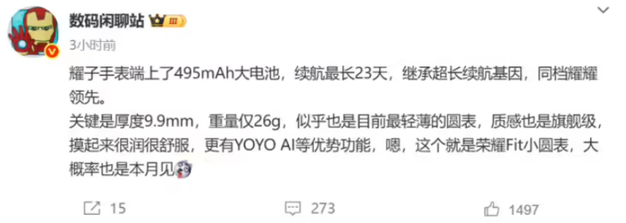 在此之前,微博博主 @数码闲聊站 曾爆料过,荣耀手表 Fit 的相关配置,新品将配备 495mAh 电池,拥有最长 23 天的长续航能力,同时机身厚度约 9.9mm,重约 26g,有望成为圆表最轻薄机身,同时还支持 YOYO AI 等功能。