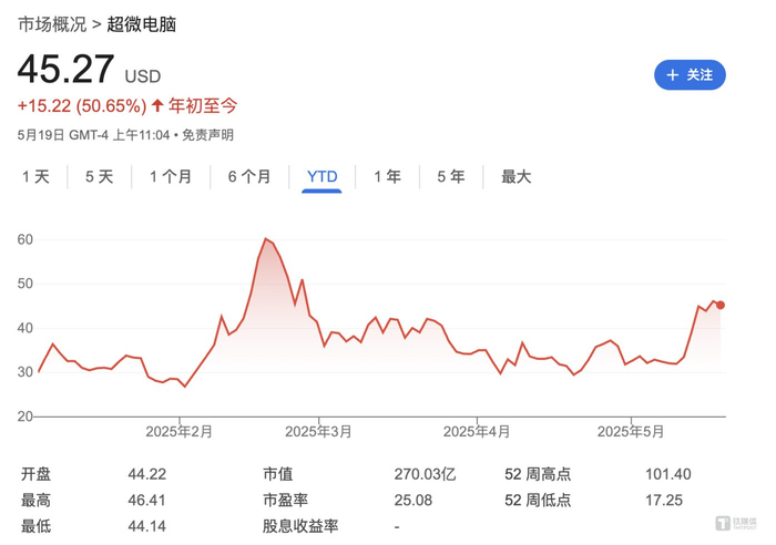 受AI热潮以及业绩不佳等因素影响,超微电脑股价迎来了“过山车”行情。2025年初至今,超微电脑已经累计涨超50%,而最近半个月的时间,超微电脑较低点累计涨超60%。