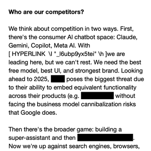 展望 2025 年,Apple(这里的 Apple 其实是打码了的,我通过 AI 恢复大概率确定是 Apple,也有很多人认为是 Meta)构成了最大的威胁,因为他们有能力在其产品(例如其生态系统)中嵌入同等功能,而且不会面临像 Google 那样的商业模式自我蚕食风险。