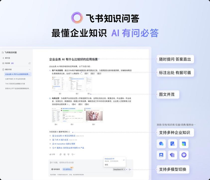 目前,飞书知识问答可支持调用豆包及 DeepSeek 两款大模型,并支持联网使用。