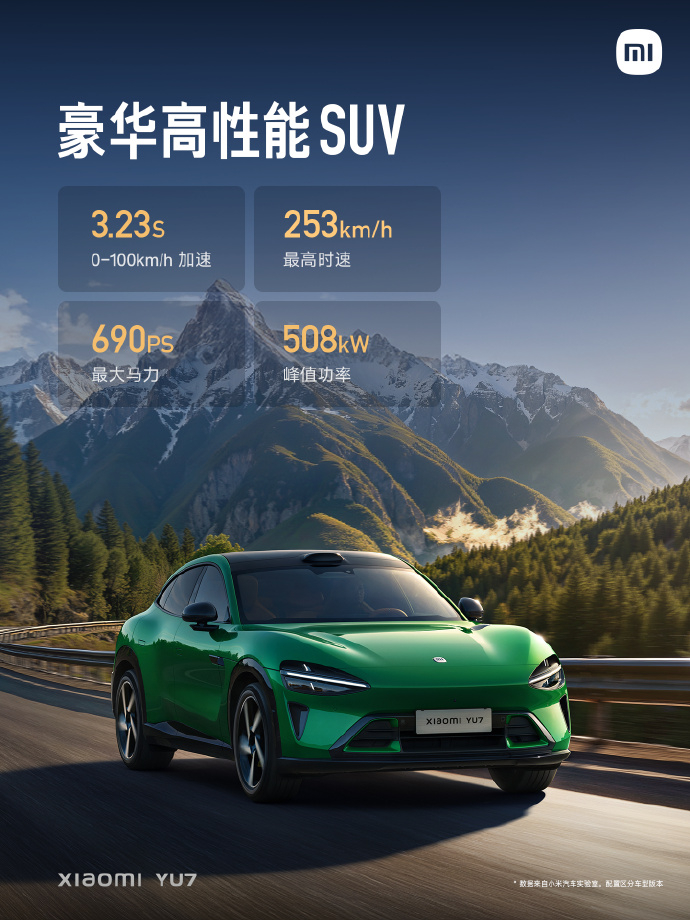 小米 YU7 Max :双电机四驱,零百 3.23 秒,峰值功率 508kW,峰值扭矩 866N・m,最高车速 253km/h。