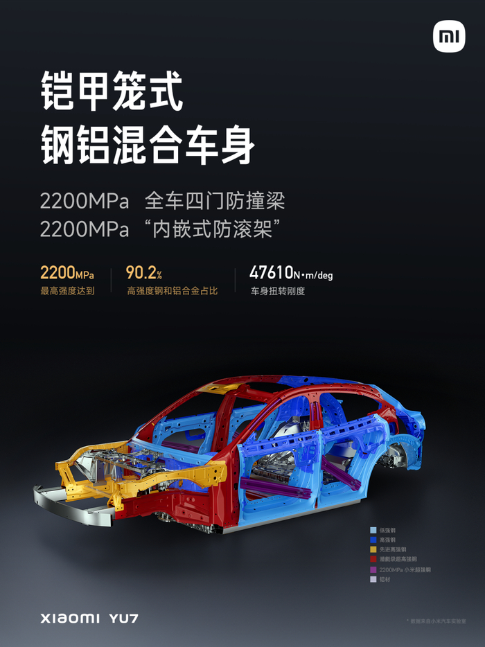 车身用的是 2200MPa 的小米超强钢,与 1500MPa 的热成型钢相比,抗拉强度高了 40% ,屈服强度高了 24% ;