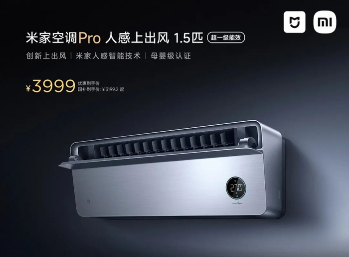 具体有两款,米家空调 Pro 人感上出风 1.5 匹:3999 元,国补价 3199.2 元;