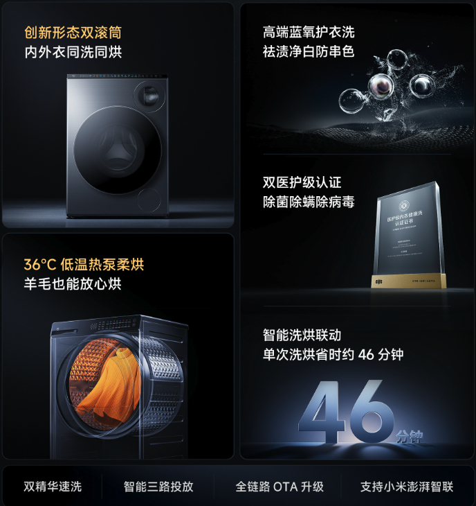 而且米家双区洗衣机 Pro 双筒均获得医护级健康洗认证,大筒支持 95℃ 高温煮洗,轻松应对顽固污渍;小筒则专注于内衣的专业护理。
