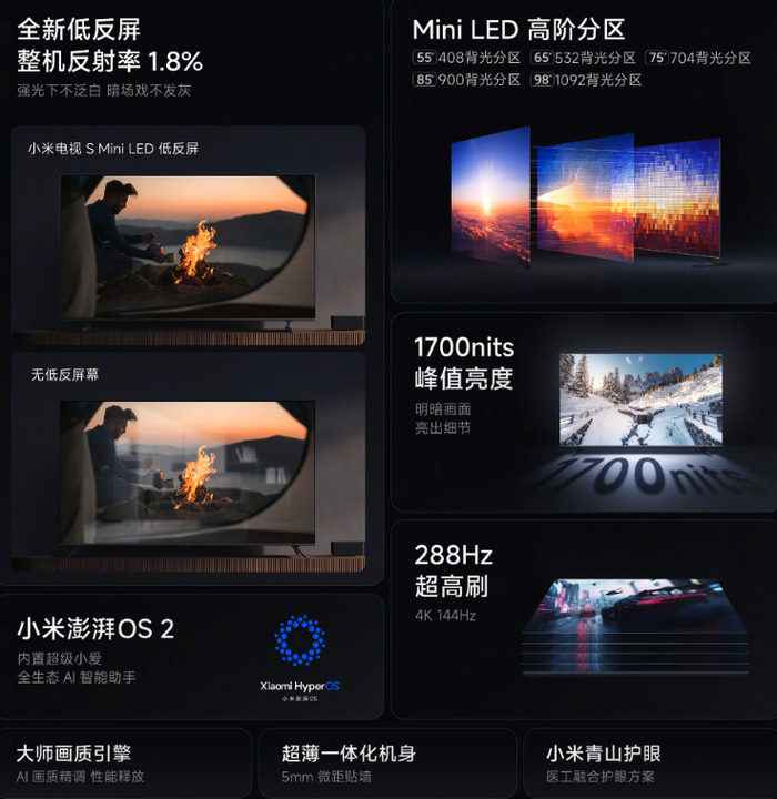 此外还支持小米青山护眼技术,搭载大师画质引擎,拥有哈曼大师级调音,运行小米澎湃 OS 2 ,内置超级小爱。