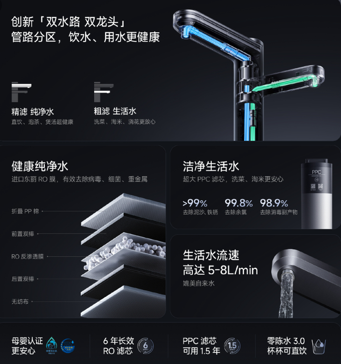 管路也进行了分区,通过 PPC 滤芯和 RO 反渗透滤芯精滤出的纯净水适用于直饮、泡茶、煲汤等;通过 PPC 滤芯粗滤出的生活水则可以用来洗菜、淘米、浇花等。