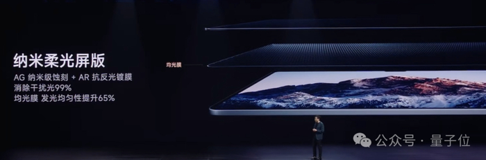 采用了纳米蚀刻技术让玻璃表面形成两三百纳米凹凸结构的漫反射层,减少光反射;再加上AR抗反光镀膜,可消除99%干扰光;均光膜加持,发光均匀度提升65%。