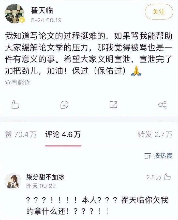 翟天临悼念好友被骂,评论区怼网友:你查重花钱是我导致的吗?
