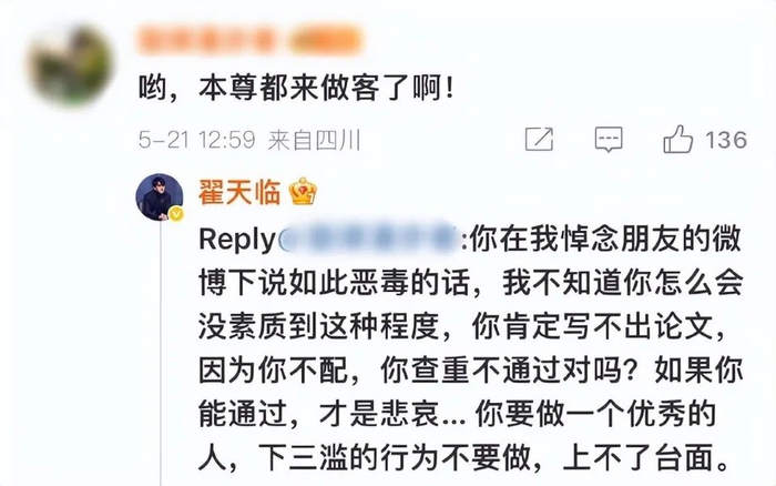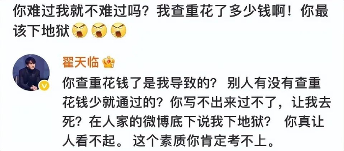 翟天临看到后直接回怼该网友,你查重花钱是我导致的吗?你写不出来过不了,就让我去死?你真让人看不起,这个素质肯定考不上。