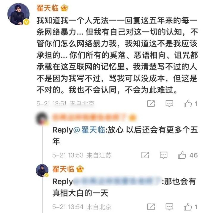 除此之外,翟天临还表示,他这5年来承受了太多的网络暴力,但他始终认为这不是他应该承担的,“你们所有的奚落、恶语相向、诅咒都承载在这互联网的记忆里……我不会认同,也不会为此难过”,他还强调,事情终究会有真相大白的一天。