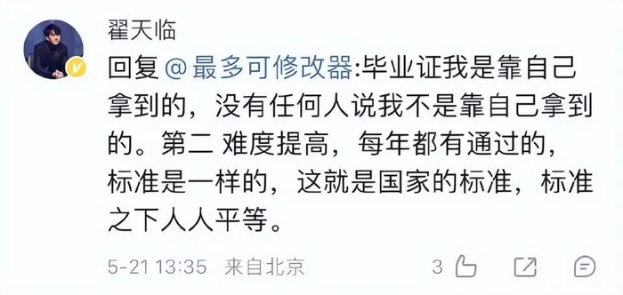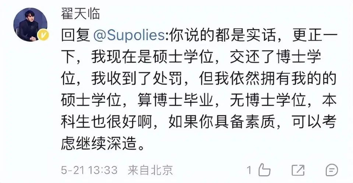 他在批评网友动不动就骂他是一种没素质的行为的同时,还强调他的毕业证是自己凭本事拿到的,而他虽然交还了博士学位,但现在依然是硕士学位。