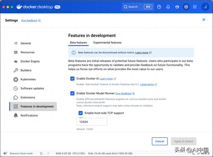 如果您运行的是最新版本的 Docker Desktop,则可以访问 Dashboard 设置以启用 Model Runner。