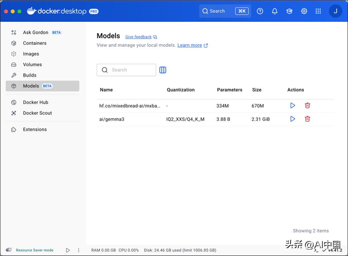 curl http://localhost:12434/engines/llama.cpp/v1/embeddings \-H "Content-Type: application/json" \-d '{ "model": "hf.co/mixedbread-ai/mxbai-embed-large-v1", "input": "Embeddings made easy" }'您还可以在 Docker Desktop 控制面板中查看下载的模型。