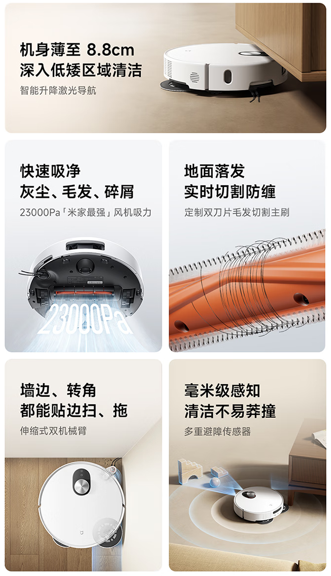 据介绍,小米米家扫拖机器人 M40 S 配备全新升降式激光导航,遇到低矮区域,导航智能下降后机身薄至 8.8cm,深入沙发底、床底等低矮区域,具有“米家最强”23000Pa 风机吸力。米家创新采用双刀割毛发主刷,地面落发边扫边切割,大吸力实时回收碎发垃圾,配合防缠边刷,减少手动清理主刷、边刷困扰。