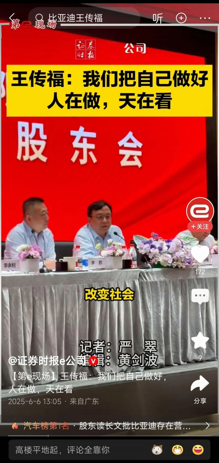 6月6日,比亚迪股东大会现场,一向坚强的王传福红了眼眶。"我只有一家企业,就是比亚迪。我们把自己做好,人在做,天在看。"