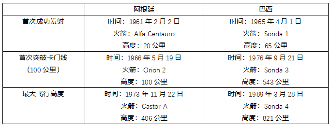 1957年,苏联发射第一颗人造卫星,拉美国家也掀起了一波火箭热。阿根廷在1960年建立了国家空间研究委员会(CNIE)。巴西于1961年成立了空间活动国家委员会组织集团(GOCNAE)。两国都把探空火箭作为发展重点,并在此后数十年里展开了一场你追我赶的区域太空竞赛。拉美两大航天强国的地位从此建立,一直持续至今。下表是两国早期探空火箭发展的主要里程碑。