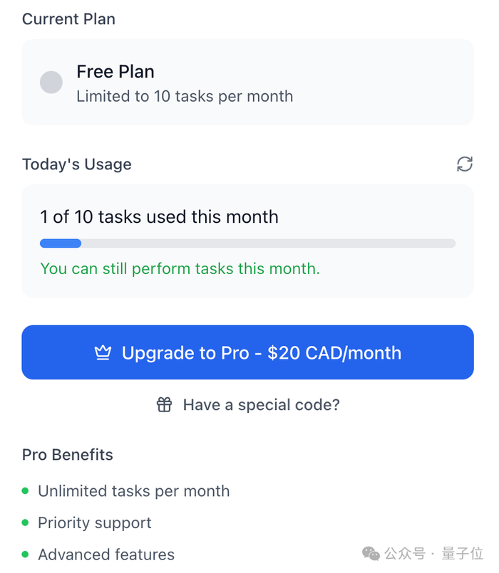 额外付费20加元(折合人民币105元)升级为Pro用户,即可享受无限次使用,并解锁高级功能,例如文本生成图像和视频、音频转录与生成等。