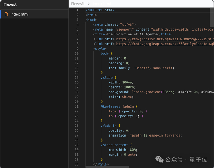 在风格设计上,FloweAI选取了专业的渐变背景(深蓝色到蓝绿色),幻灯片之间过渡平滑,并能自动适配不同屏幕尺寸,字体排版也较为规整。