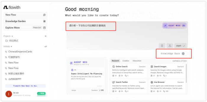 这三者协同工作,才构成了Flowith完整的战斗力。它是一个集策略、专业知识和强大执行力于一体的闭环系统。