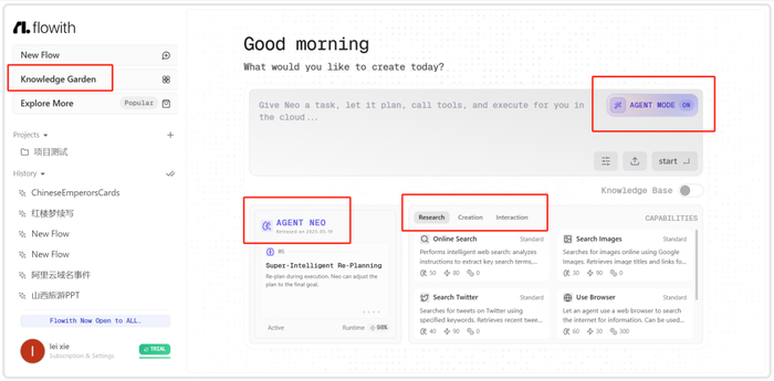 Agent Neo是Flowith的王牌,被誉为“全球首个无限智能体”。它为处理那些传统AI无法胜任的、极其复杂的长期任务而生。它的“无限”体现在: