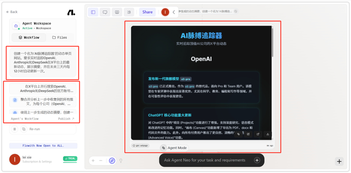 第二步:审查“配方”。 启动Agent Neo后,神谕模式会展示它自动生成的执行计划。你可以看到它打算如何调用搜索工具、如何设计网页结构、如何设置定时任务。