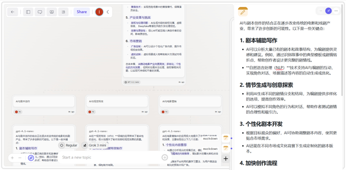 第二步:并行探索。 从中心节点拉出三个分支,分别让AI探讨“AI与剧本创作”、“AI与视觉特效”、“AI与电影营销”。